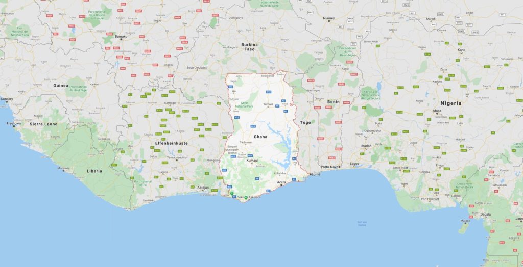 Ghana ist ein Staat in Westafrika, der an die Elfenbeinküste, Burkina Faso, Togo sowie im Süden an den Golf von Guinea als Teil des Atlantischen Ozeans grenzt. Seine Fläche ist fast so groß wie die des Vereinigten Königreichs, mit dessen Geschichte es durch die Kolonialzeit eng verbunden ist. Die Hauptstadt Ghanas ist die Metropole Accra, die zweite Millionenstadt ist Kumasi.